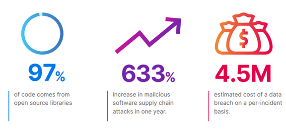 - Rủi ro từ các lỗ hổng: Các thư viện open source thường xuyên chứa các lỗ hổng bảo mật có thể bị khai thác. Theo thống kê, số lượng các cuộc tấn công vào chuỗi cung ứng phần mềm ngày càng tăng, với 633% tăng trong năm vừa qua. Việc không rà quét và quản lý rủi ro từ các thành phần open source có thể dẫn đến những hậu quả nghiêm trọng.